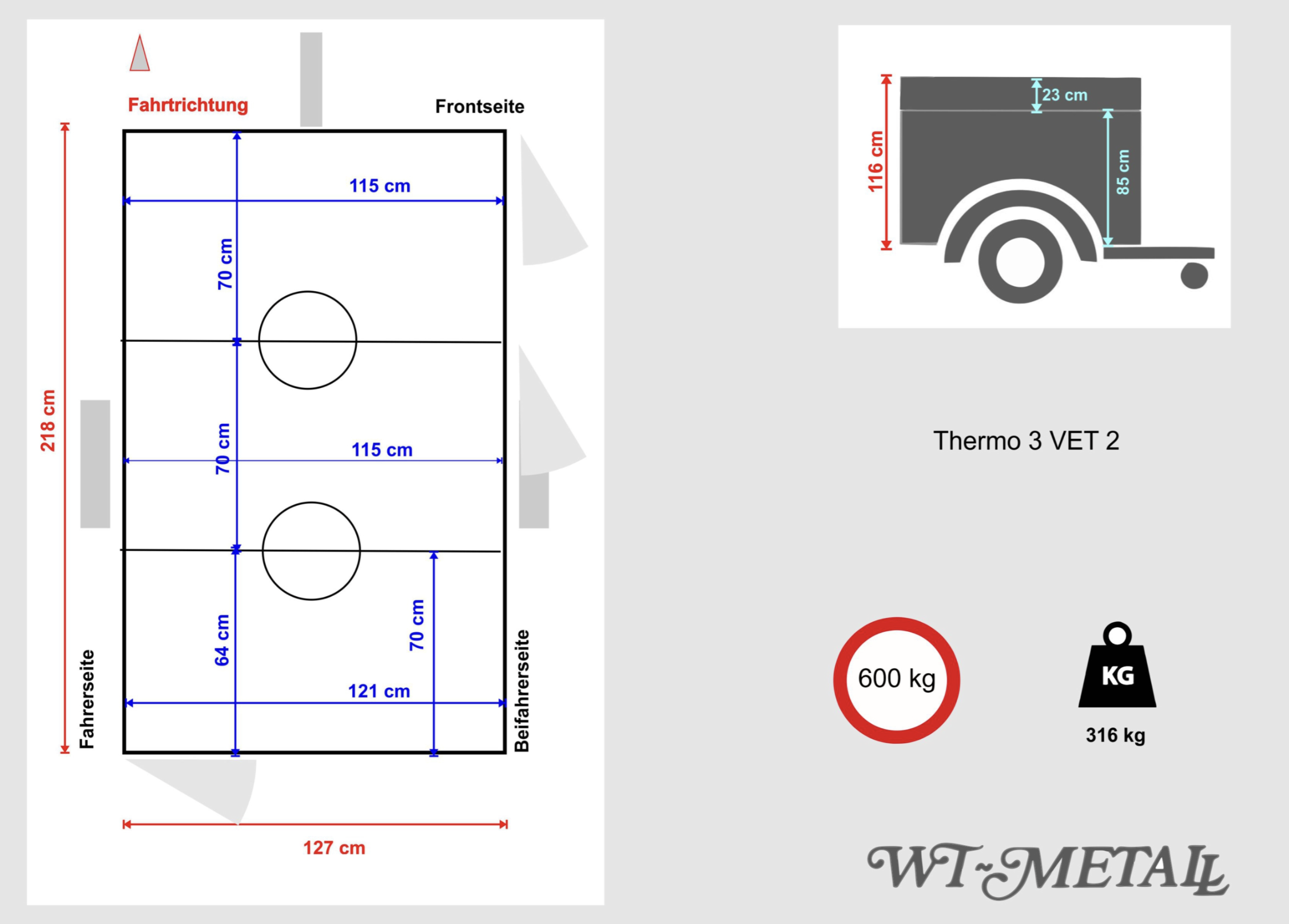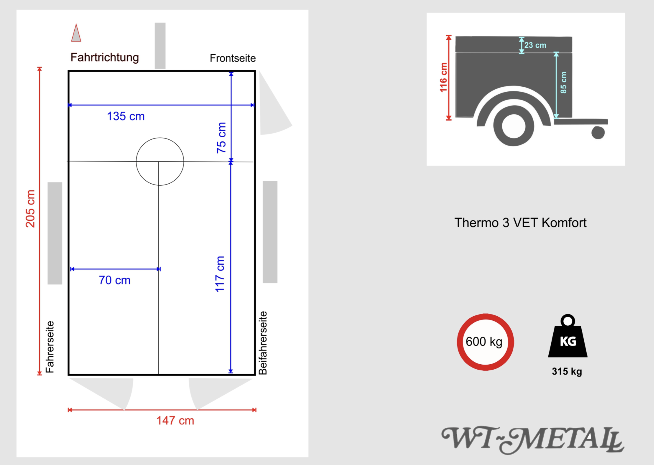 Der Hauptunterschied zwischen den WT‑Metall Thermo VET‑Modellen und den Thermo VET Komfort‑Modellen liegt in der Ausstattung der Zugänge und Türen. Bei den Standard‑VET‑Anhängern sind die Hundeboxen klassisch mit quer angeordneten Türen ausgestattet, während die VET Komfort‑Modelle zusätzlich gezielt mehr und bessere Einstiegsmöglichkeiten bieten – z. B. 2 Türen hinten und 1 seitliche Tür, die den Zugang zu den Boxen erleichtern und den Komfort beim Be‑ und Entladen der Hunde erhöhen.