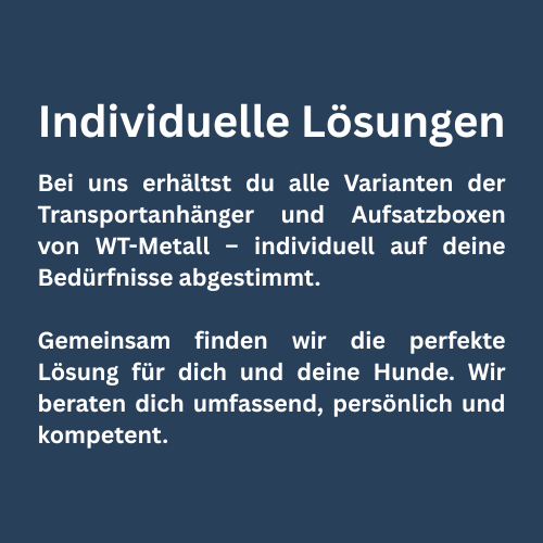 Sicherheit, Komfort und höchste Verarbeitungsqualität prägen jedes Produkt von WT-Metall: Seit Jahrzehnten entstehen Hundetransportsysteme, die exakt auf die Bedürfnisse von Hunden, ihren Menschen und professionellen Anwendern abgestimmt sind – von stabilen Anhängern über Thermo-Aufsatzboxen bis hin zu individuell gefertigten Lösungen. Durchdachte Konstruktionen, zuverlässige Materialien und eine präzise Fertigung in Deutschland sorgen dafür, dass Ihr Hund unterwegs jederzeit bestens geschützt ist.