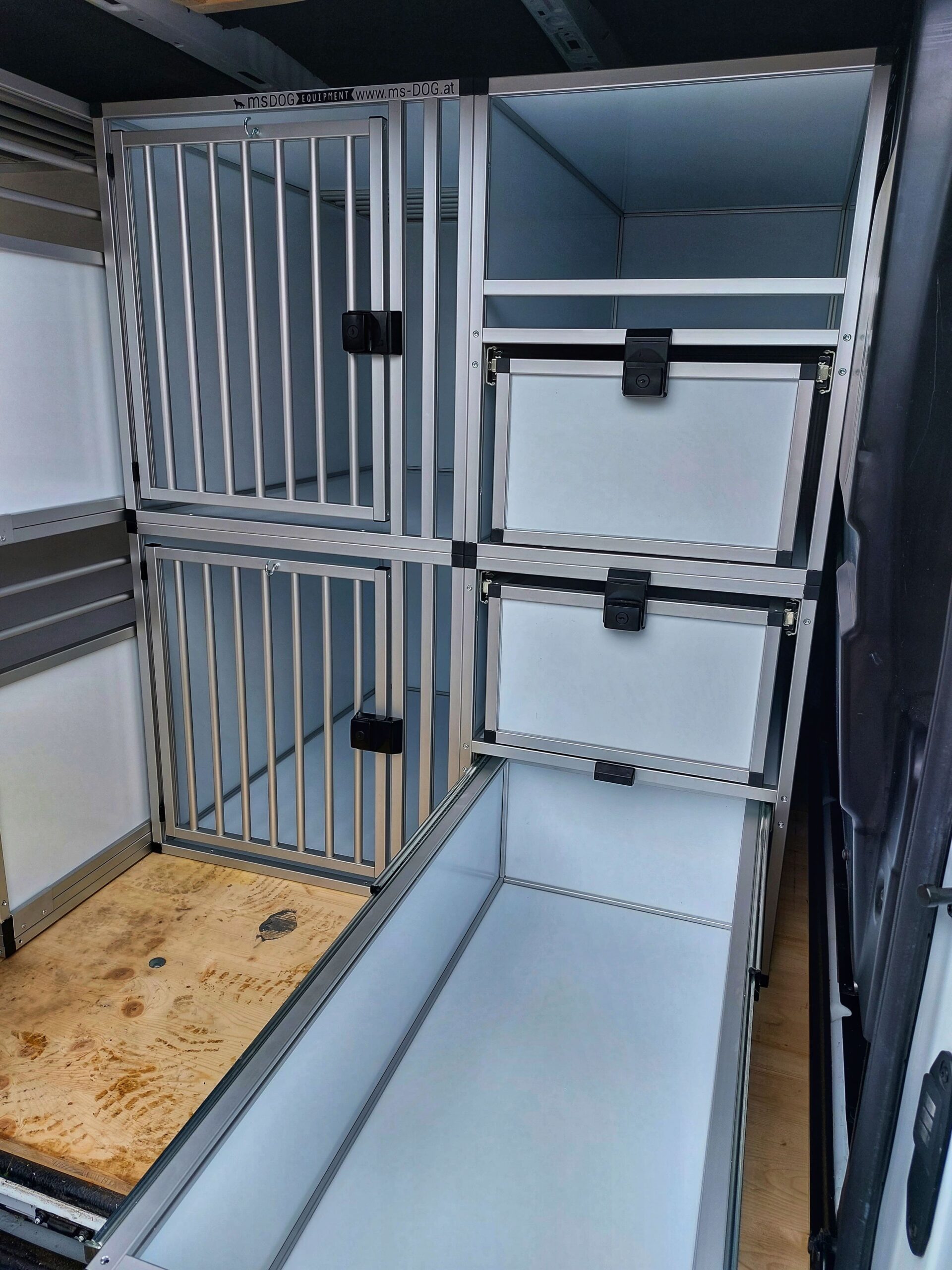 Wahlweise lassen sich die Hundeboxen auch mit praktischer Beleuchtung ausstatten, die für beste Sicht im Inneren sorgt. So behält man den Überblick, und dein Hund fühlt sich sicher und wohl, selbst bei Dämmerung oder Nacht.